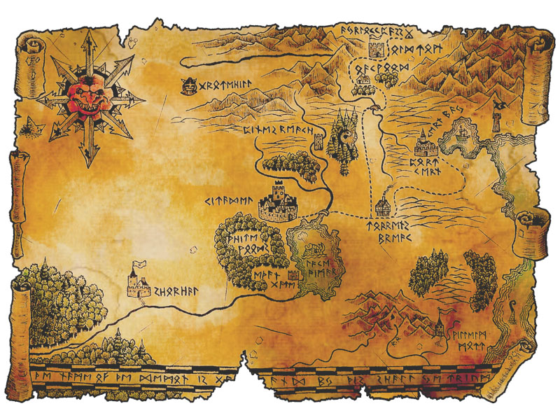 A map of the Shin High Terror campaign, re-drawn after an original by our DM. It was almost certainly better as a black and white line drawing before I tried to weather it with tea and Adobe Photoshop.