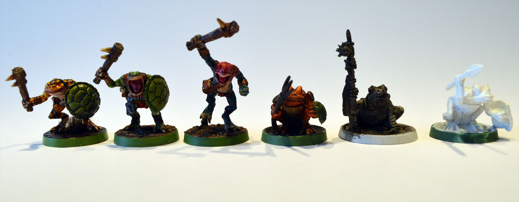 Three Otherworld Miniatures lesser boglings, two Reaper Bones II frogmen/squog warriors, one Reaper Dark Heaven Legends squog shaman.