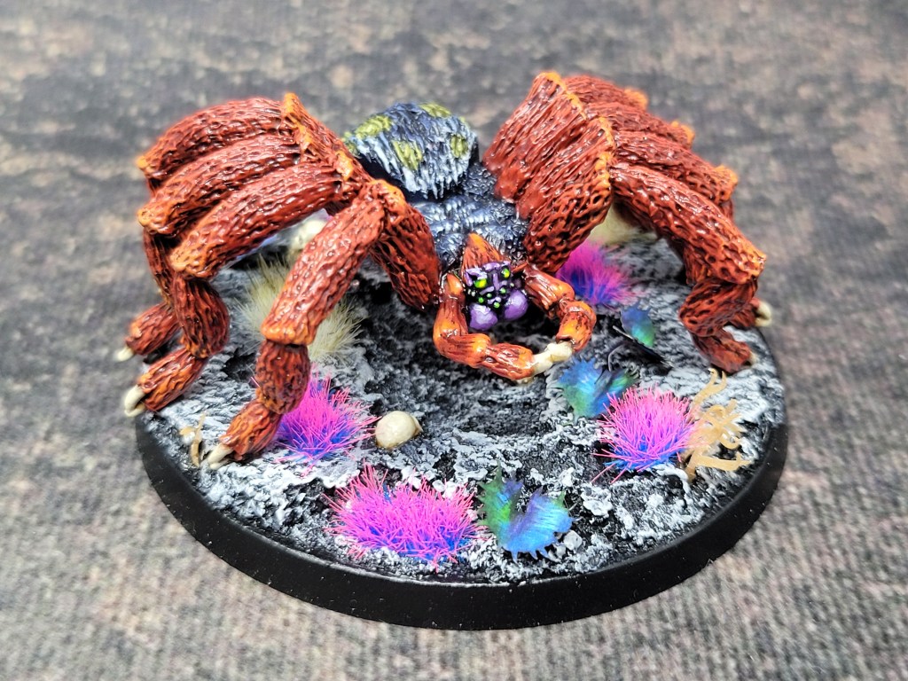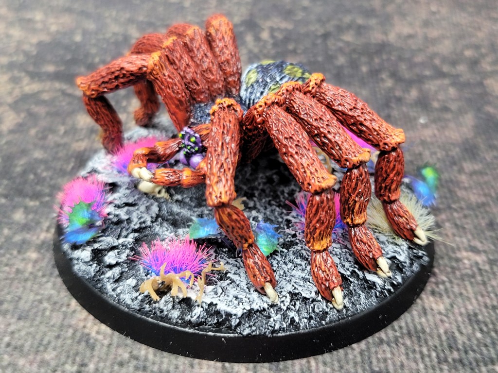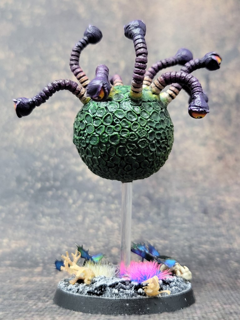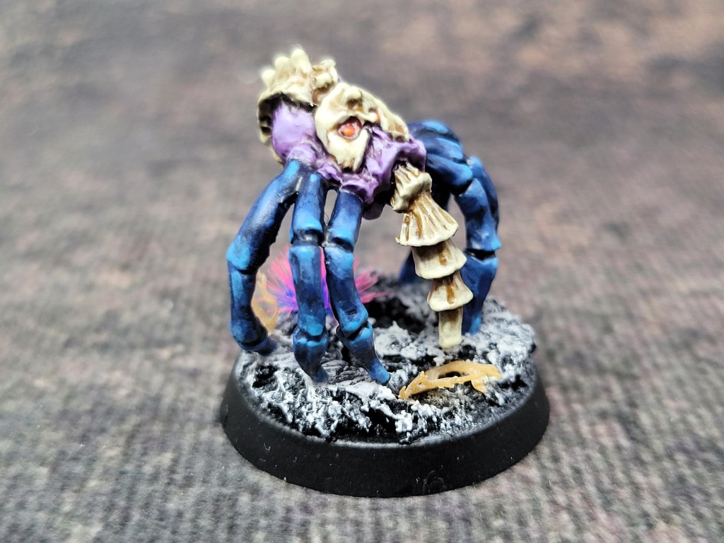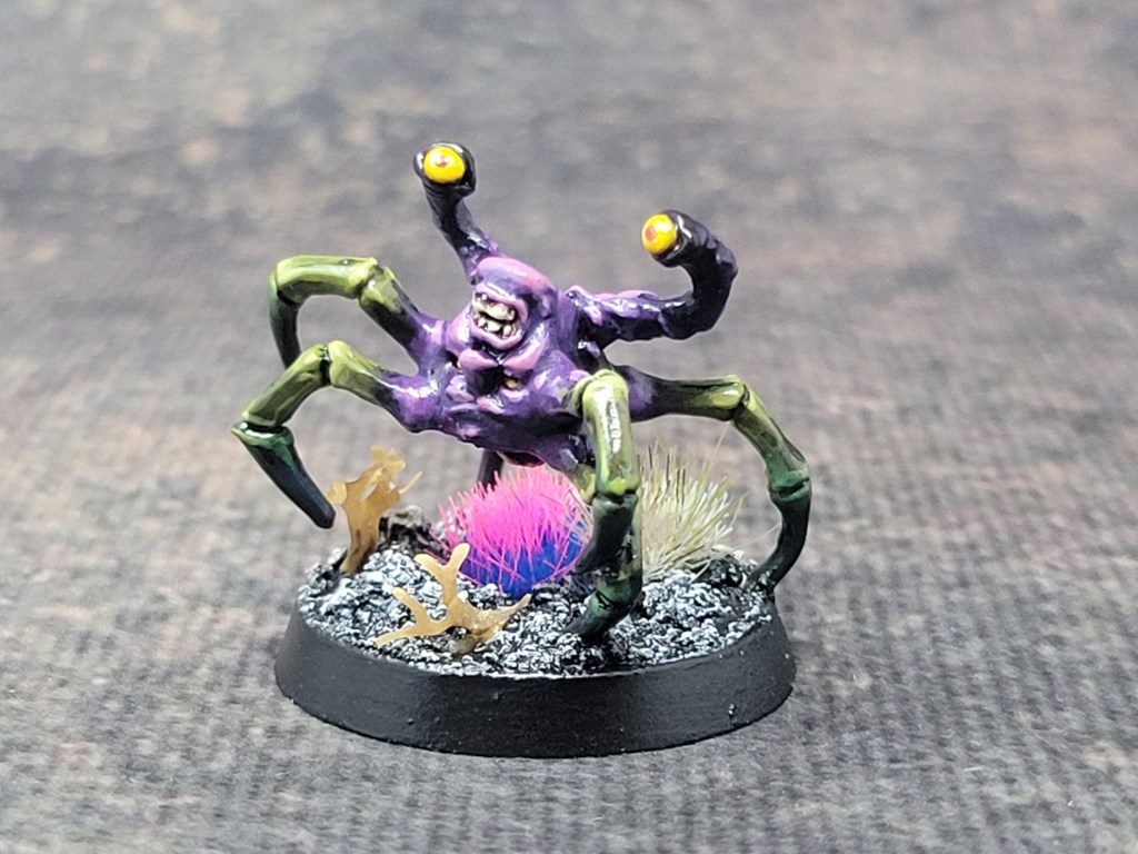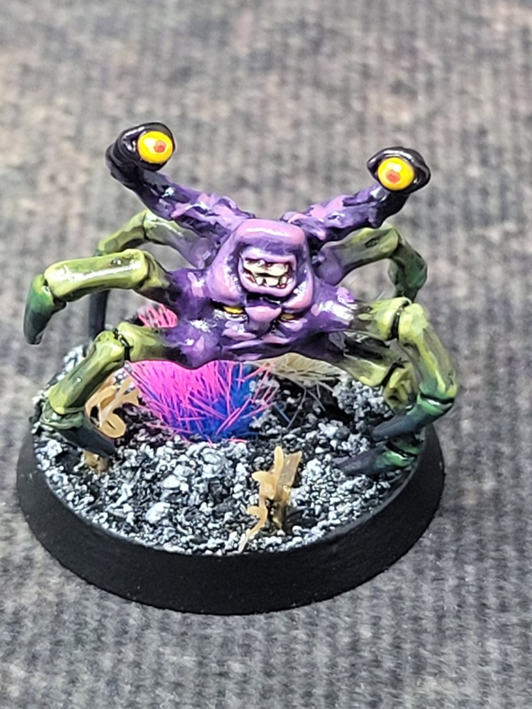 The rest are repurposed odds and ends – an Otherworld Miniatures eye tyrant (a beholder proxy standing in for a Rogue Trader enslaver), a Tom Meier big tooth woolly, available from Ral Partha Legacy… which might represent a bouncer (it’s got the legs for it) or a giant carnivorous sand clam (it’s got the mouth for it), and a fan sculpt squig that was bundled free with some other minis and might represent another insectoid or spider.