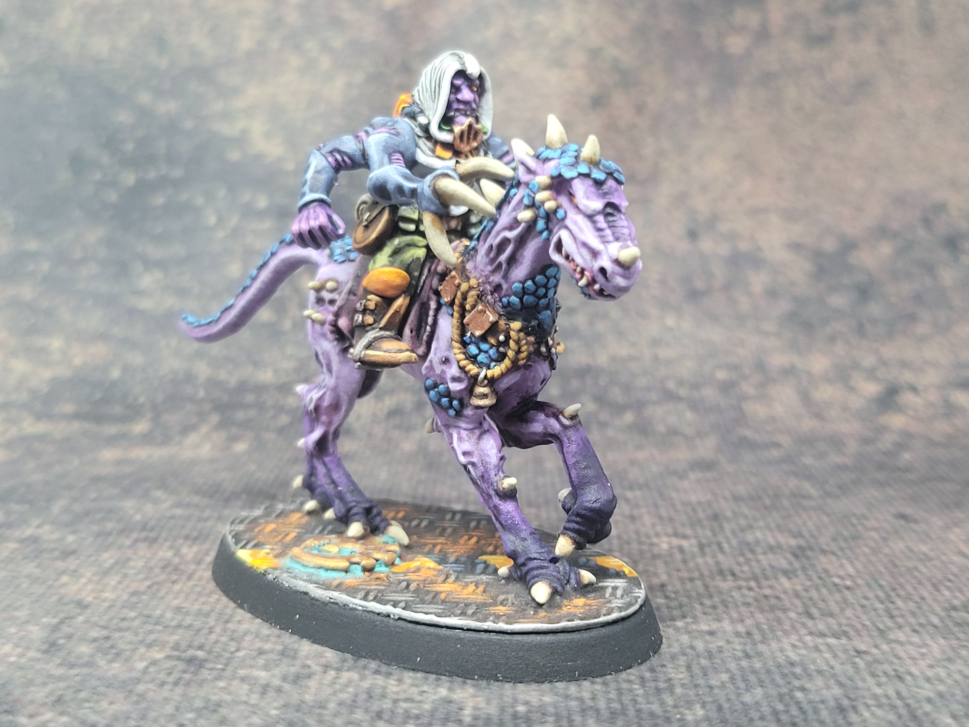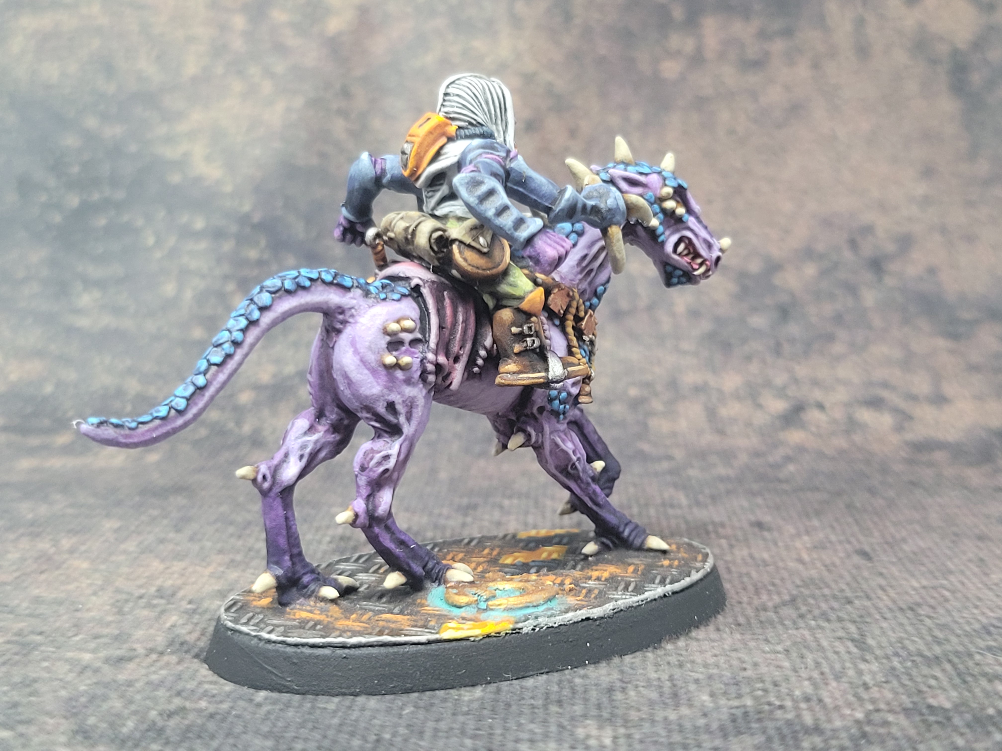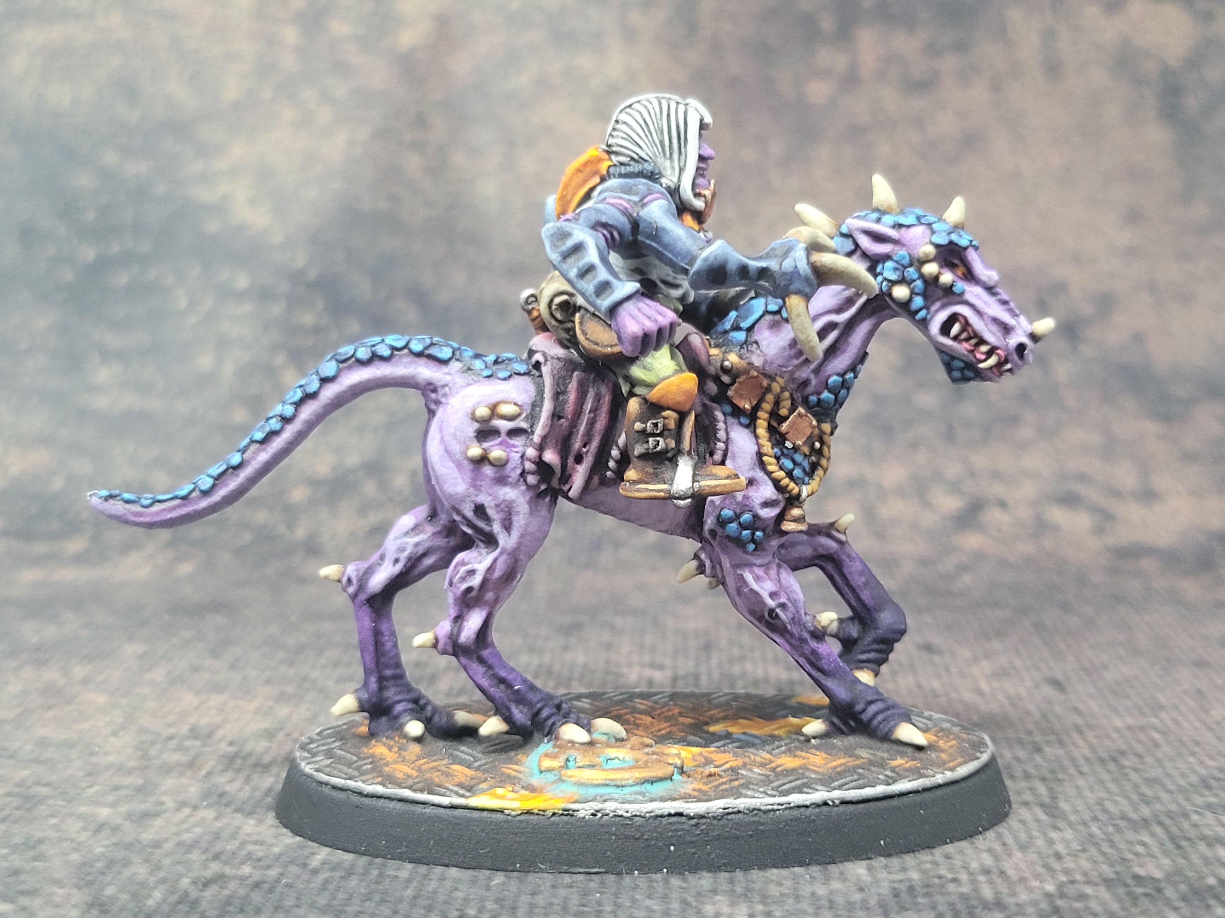 Which leaves just one more miniature, which is really two: a classic Bob Olley mounted genestealer hybrid, from a limited release in the early ’90s I think, pinned and glued firmly to the back of a Gorkamorka ‘mutie horse’ (with a little customisation – a knife and icon from the modern genestealer upgrade sprue). I’ve seen this done before, and probably a little better, but I’m happy enough with the result. It’s nice to paint so much purple on one model, Olley’s sculpts are just packed full of wonderful detail, and the mutie horse looks like it could have been made with the Cult in mind.