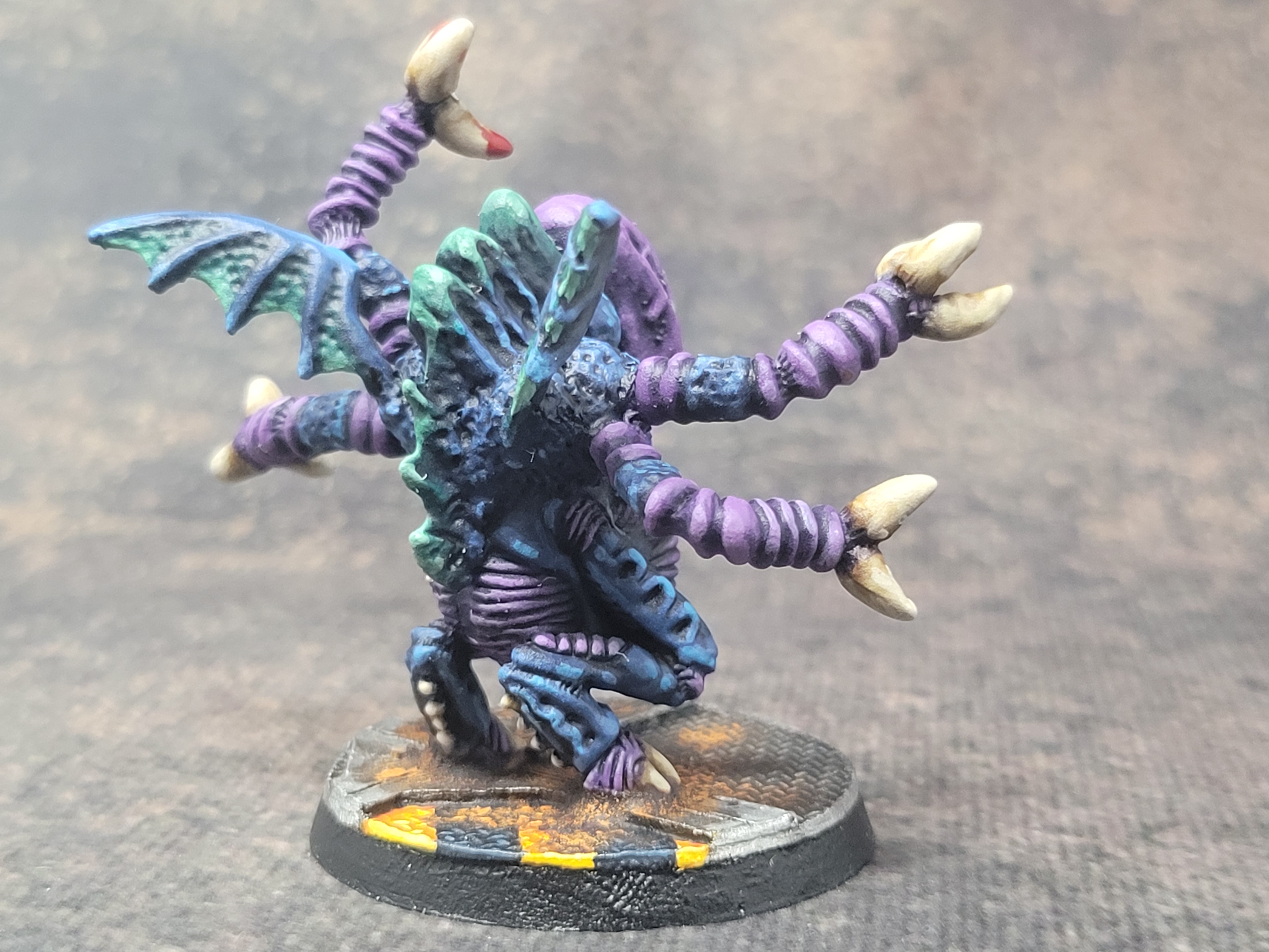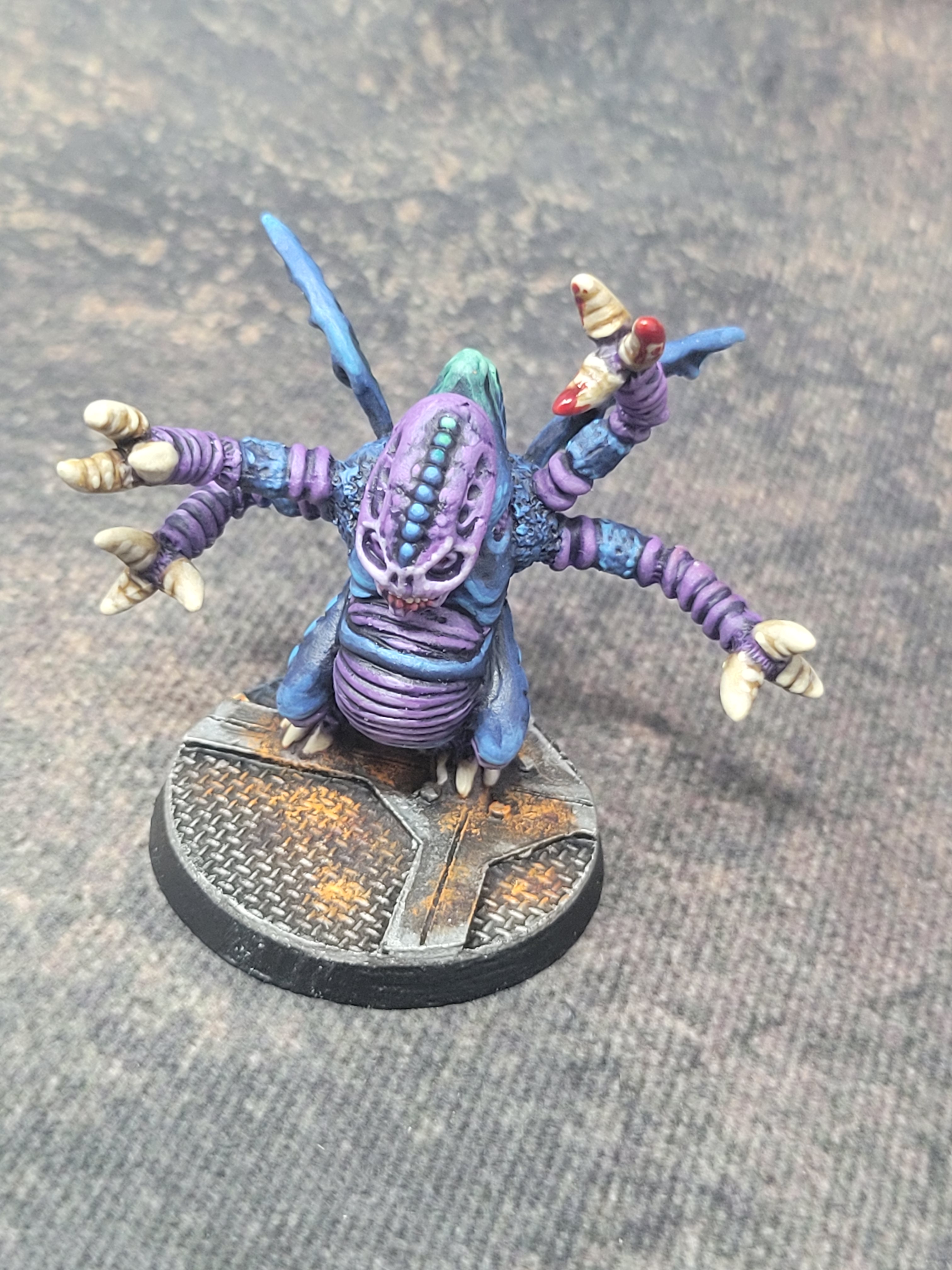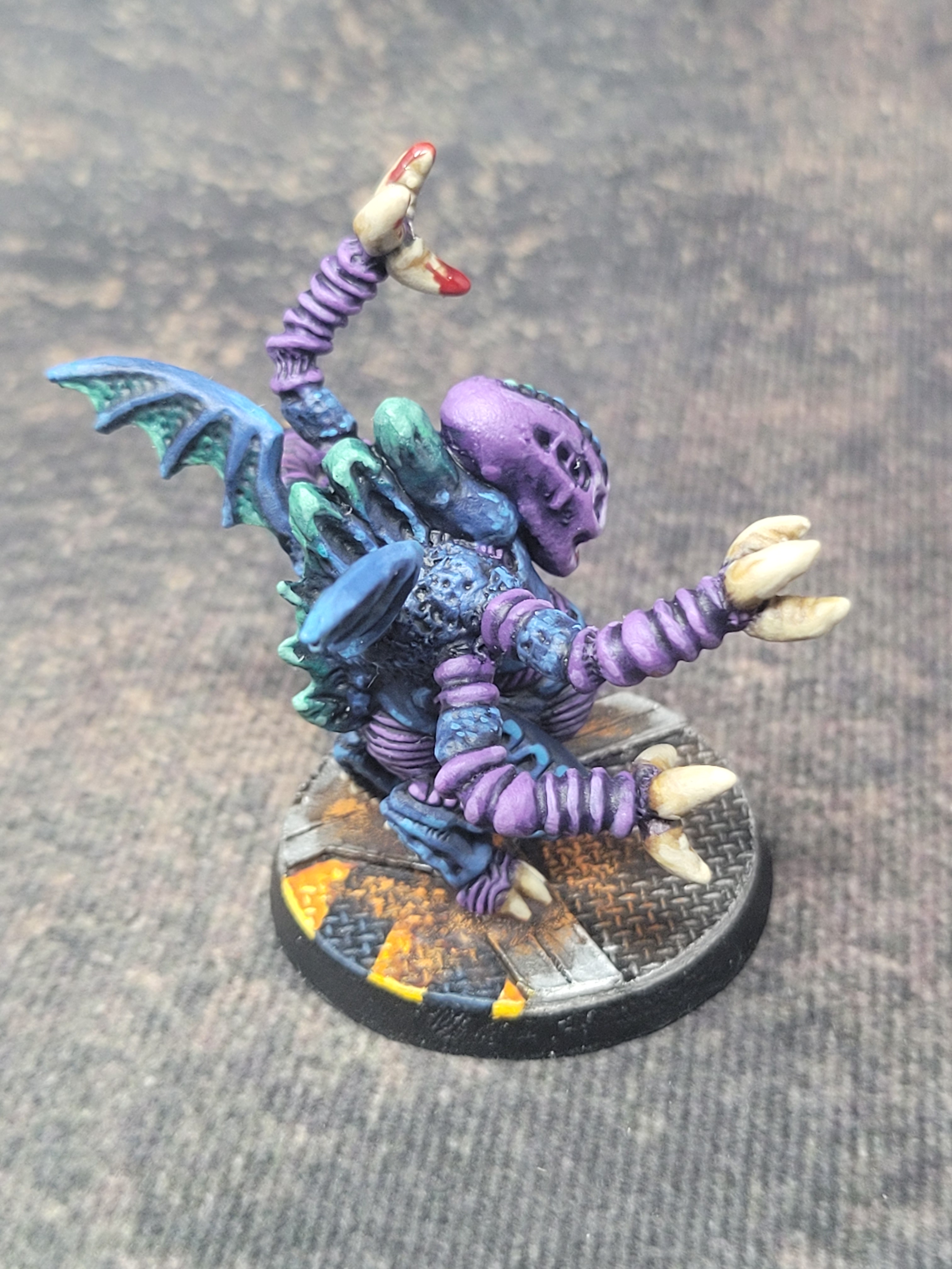 He’s a little smaller than I expected and a good amount smaller than his bear-hybrid brother the gene-ripper, but still cuts an imposing figure with his sprawling arms. He could also be more imposing, as the kit comes with a couple of extra claws, range of heads, and a single tentacle. I went more flor classic genestealer-meets-Cthulhu vibes, but he can be much more chaotic.