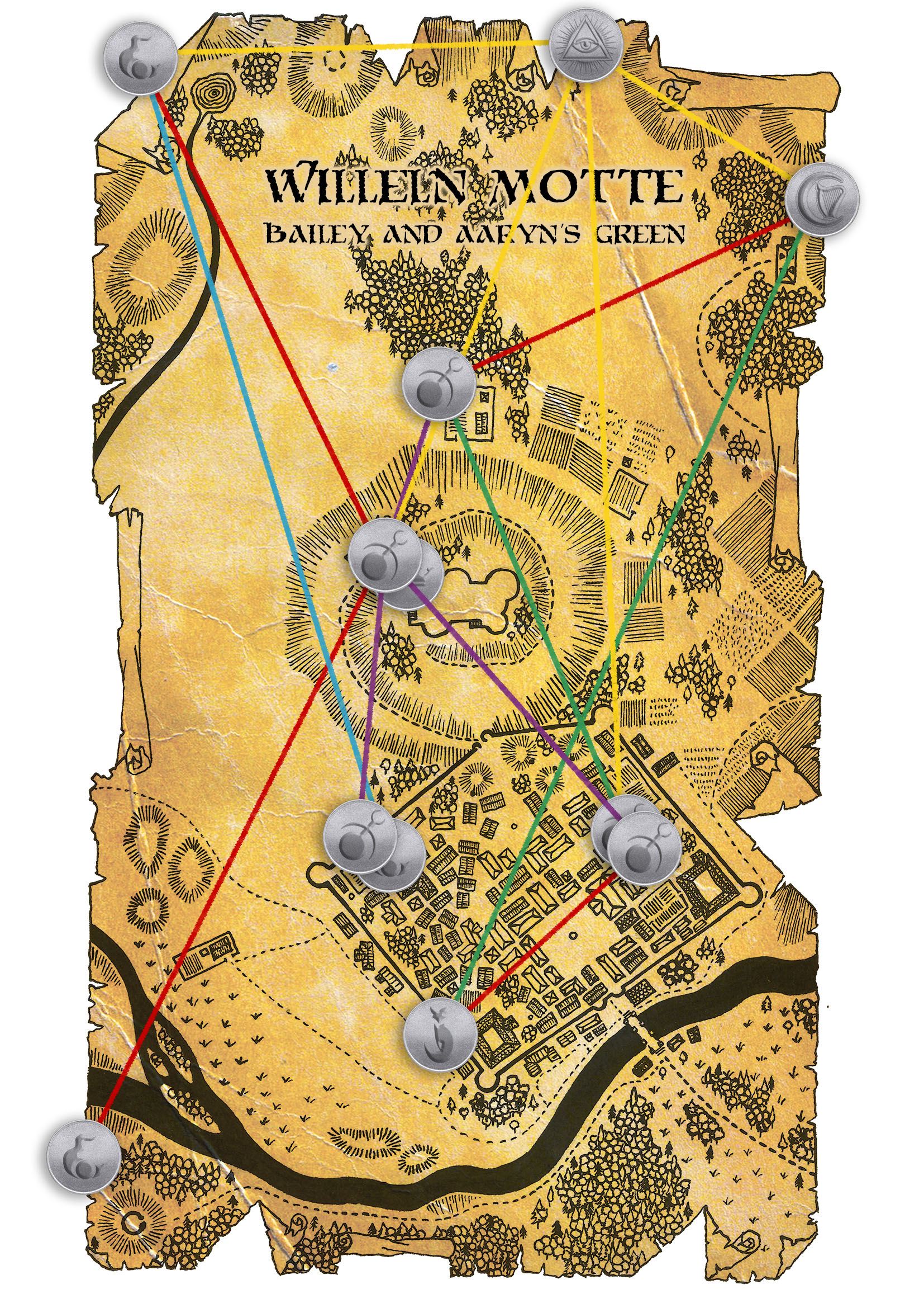 Lastly, here’s two maps of the same settlement, Willeln Motte; one fairly obviously drawn with Inkarnate, the other a mix of pen and digital. Another of John’s original creations, I’d filled this frontier town with competing gangs of cultists and spies, watchmen and reivers, all coming slowly unravelled under the psychic influence of a monstrous creature in the foothills. These groups are represented by a hodgepodge of D&D, Warhammer, and other symbols on the second map. I wanted the maps of the town itself to be fairly loose (so as not to get too bogged down navigating the streets), while picking out a few sites of interest in the surrounding area, to encourage exploration and free-flowing sessions where the players could lead the game.