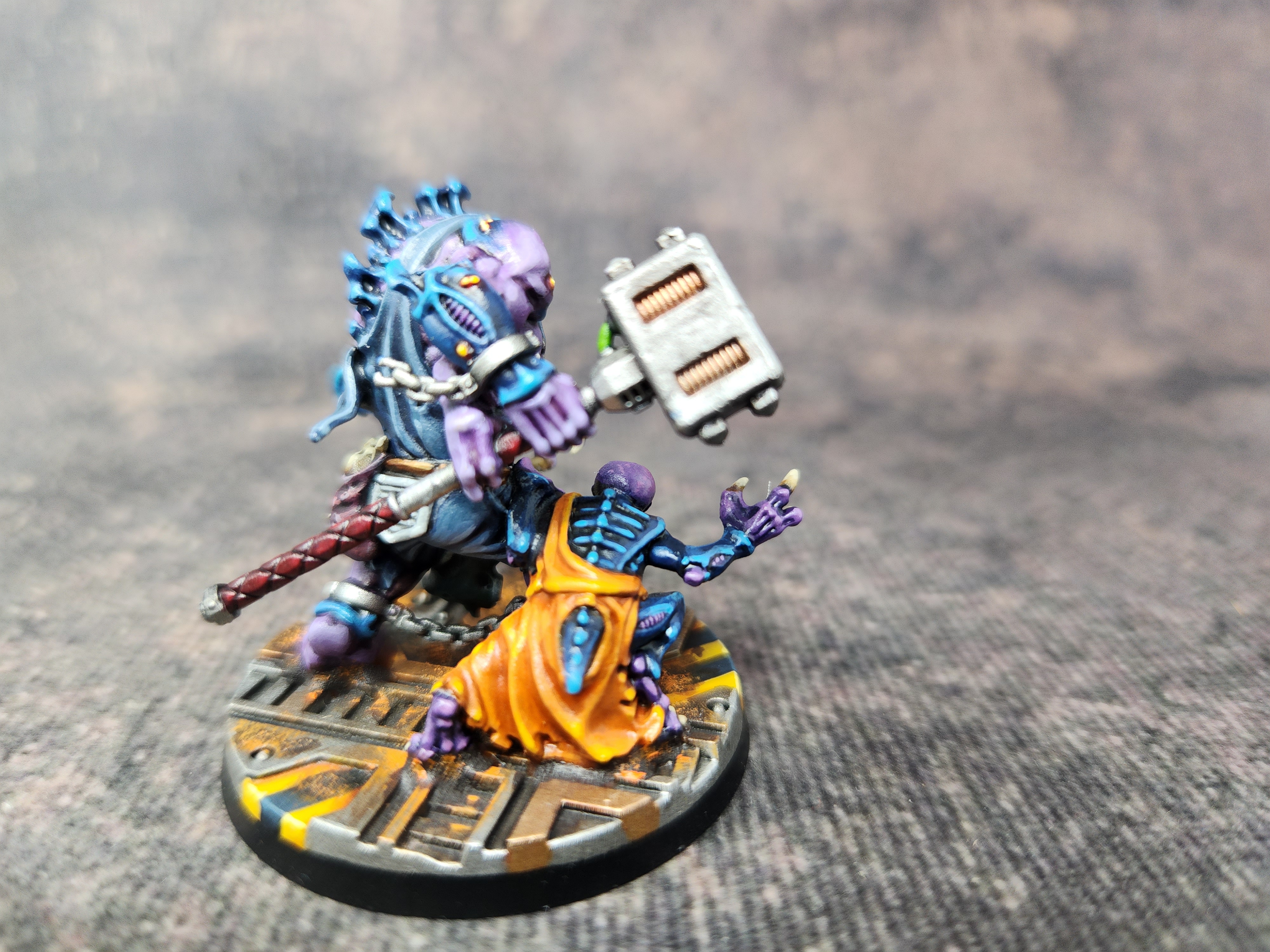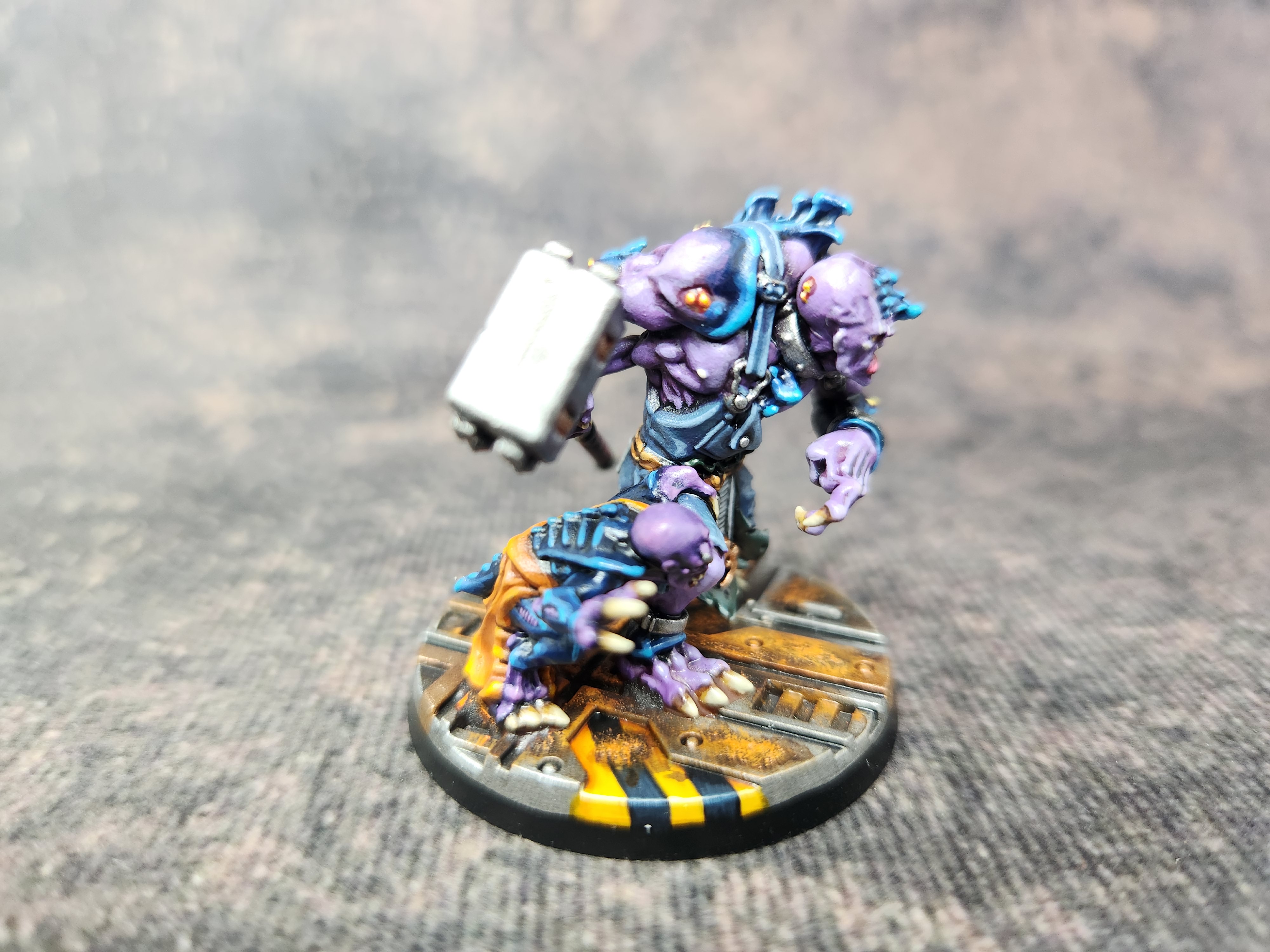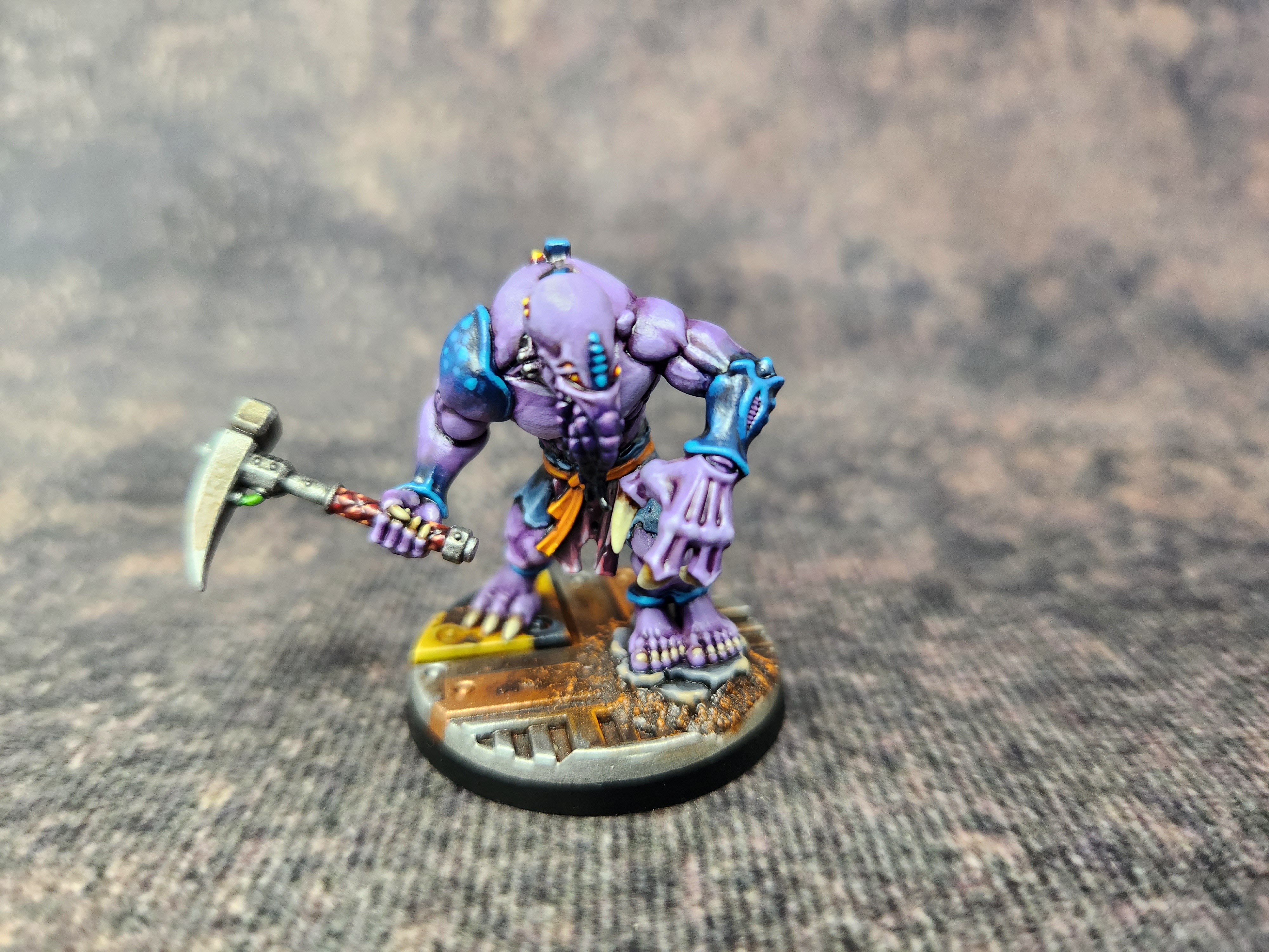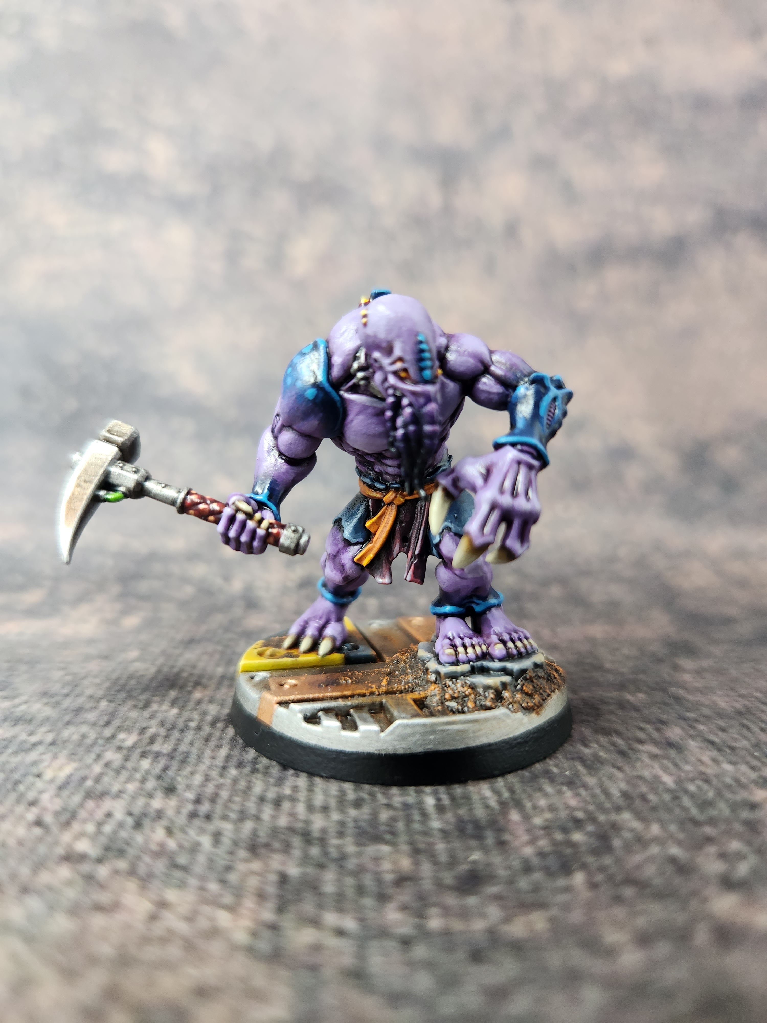 I’ve used mostly the same colour scheme as for my other genestealers, the only difference being that this is the first with a deep purple robe. I thought that would look better than burgundy, green, orange, or any of the other colours that I’ve been using for clothing. I think it’s turned out well, somewhat unique while still in keeping with the rest of the cult.
