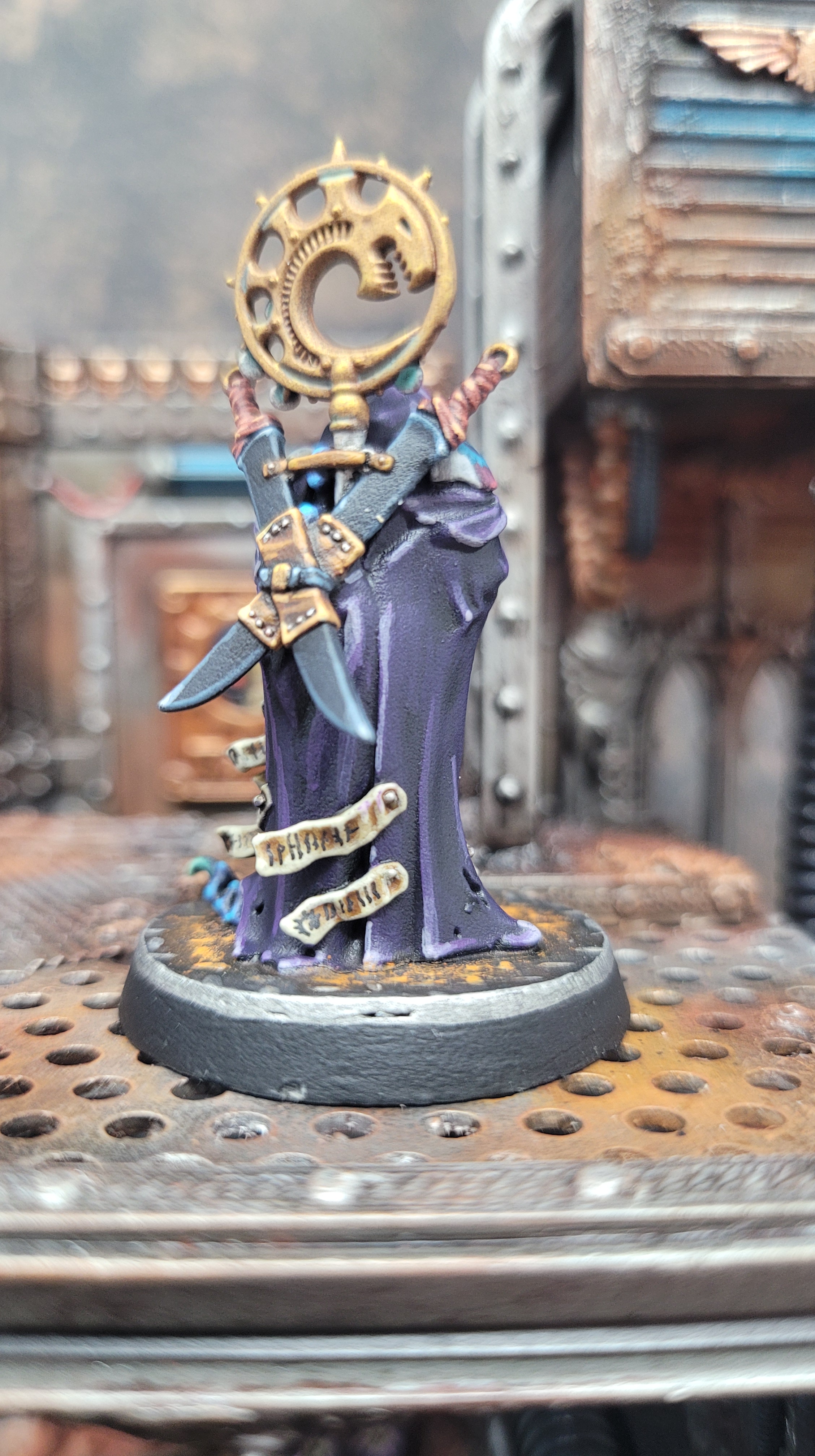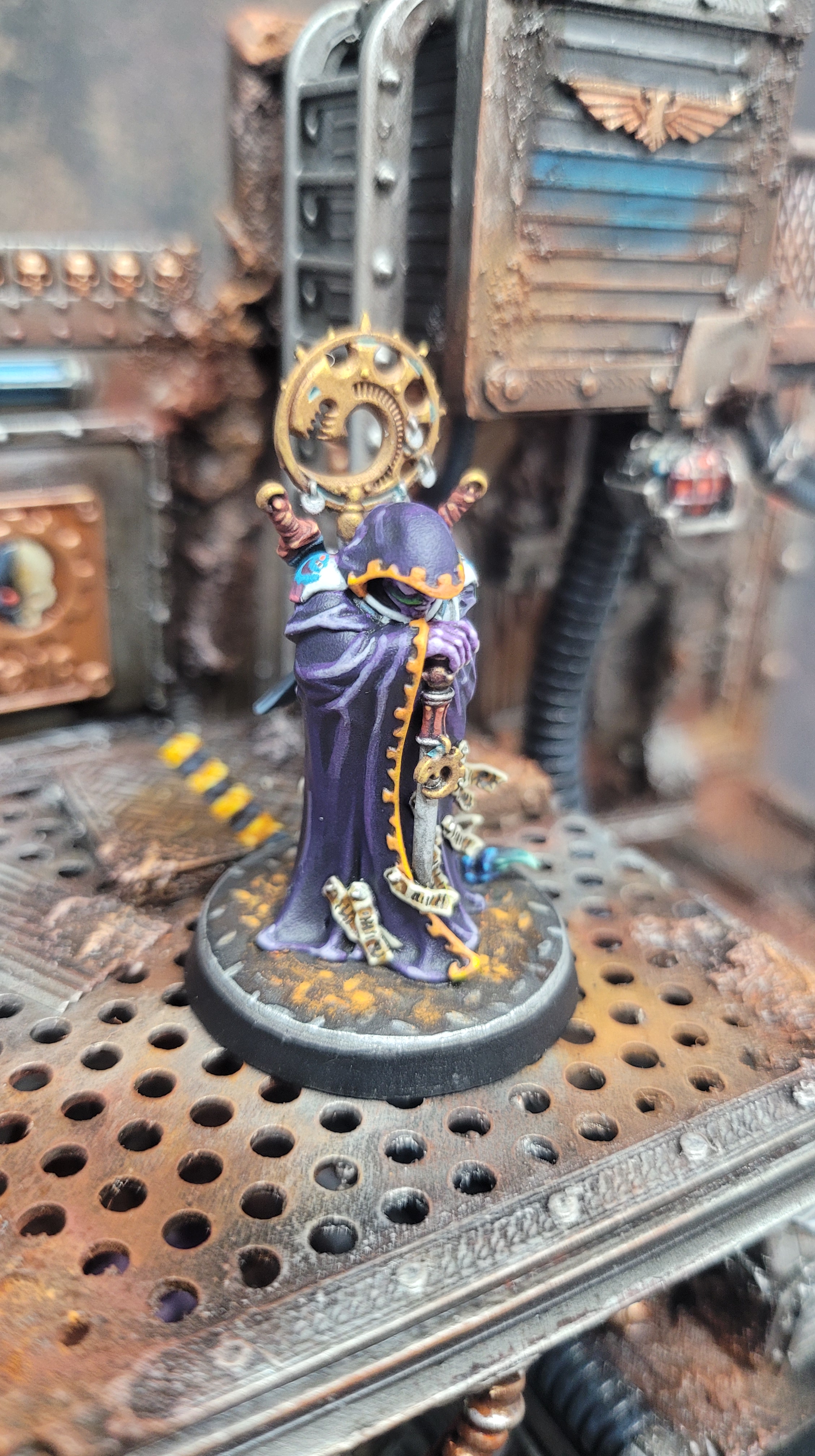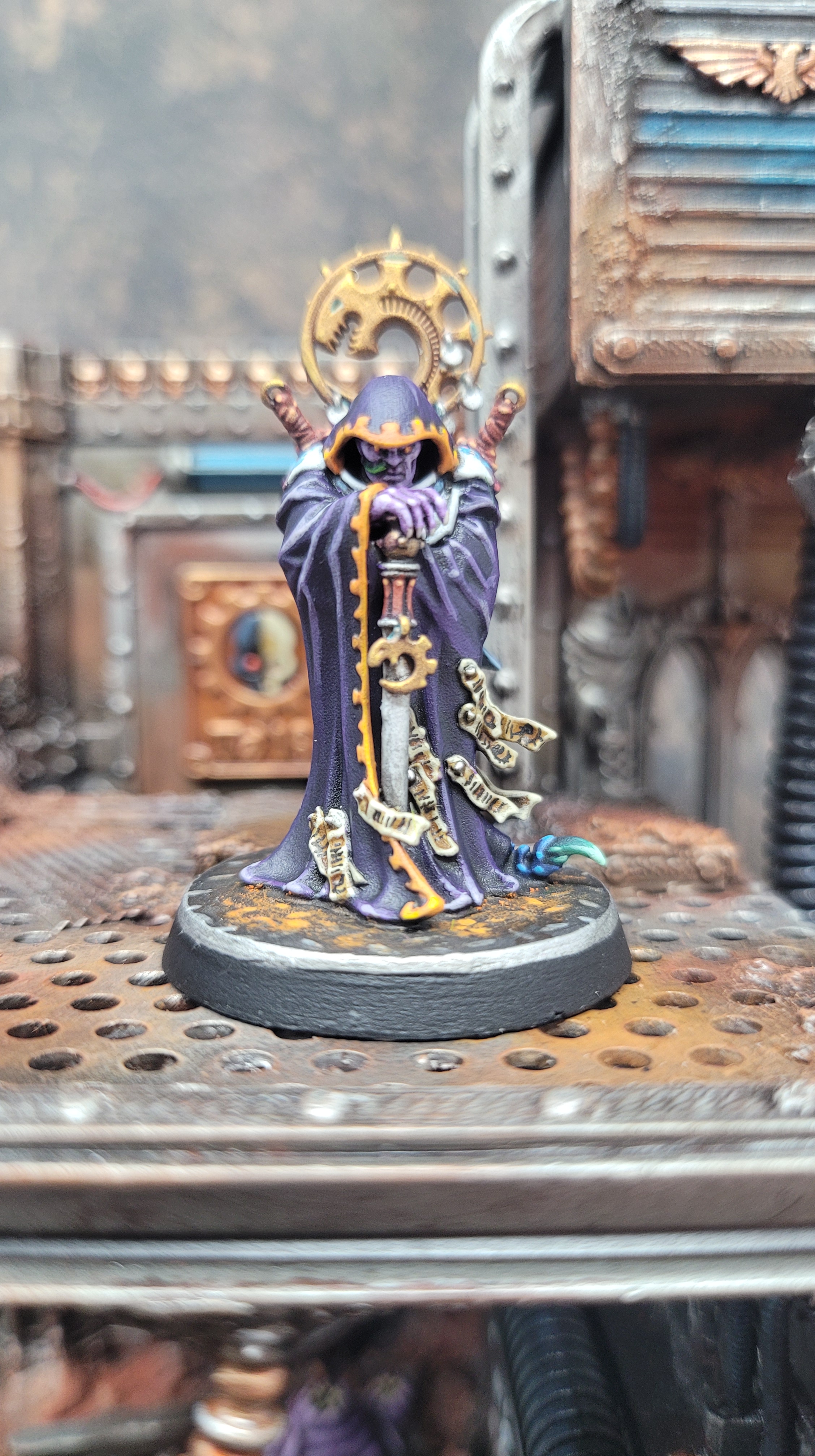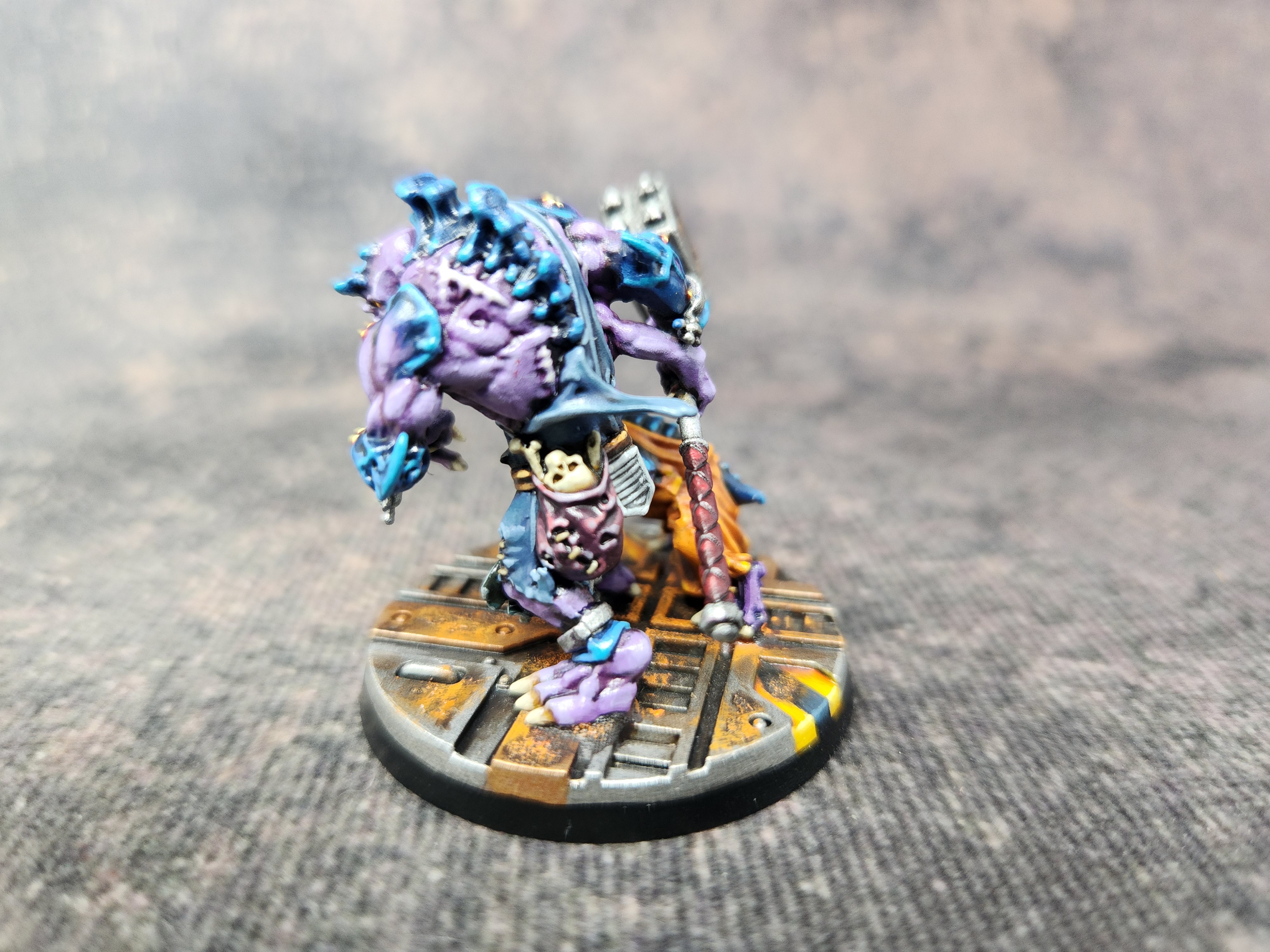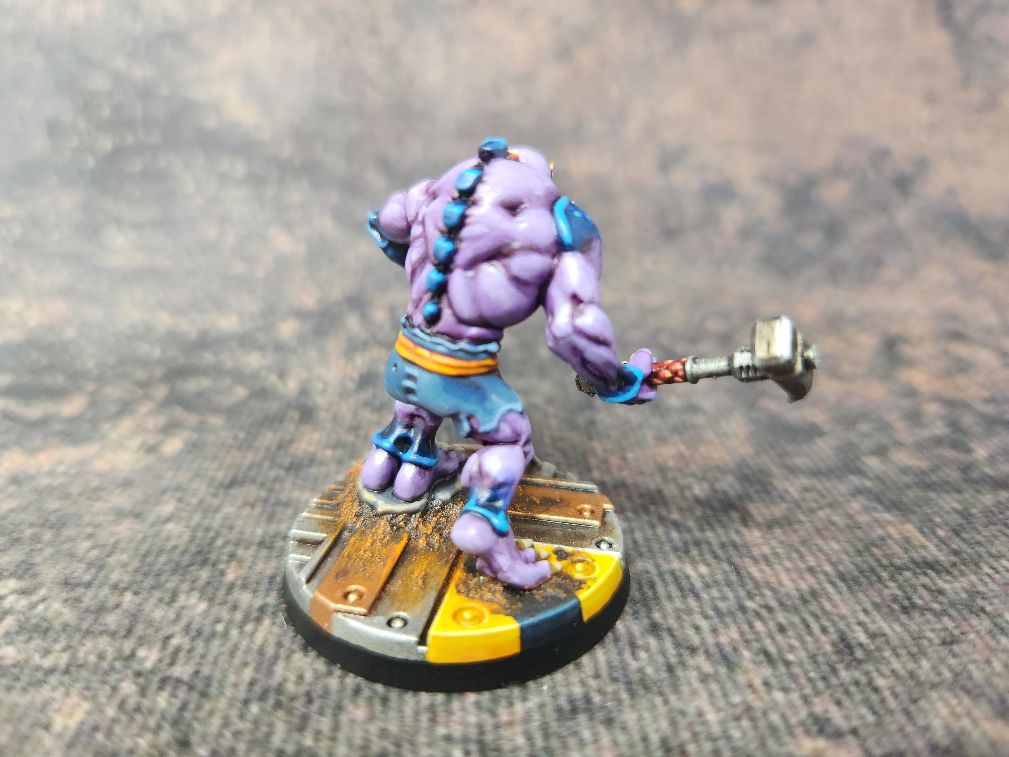 I’ve used mostly the same colour scheme as for my other genestealers, the only difference being that this is the first with a deep purple robe. I thought that would look better than burgundy, green, orange, or any of the other colours that I’ve been using for clothing. I think it’s turned out well, somewhat unique while still in keeping with the rest of the cult.
