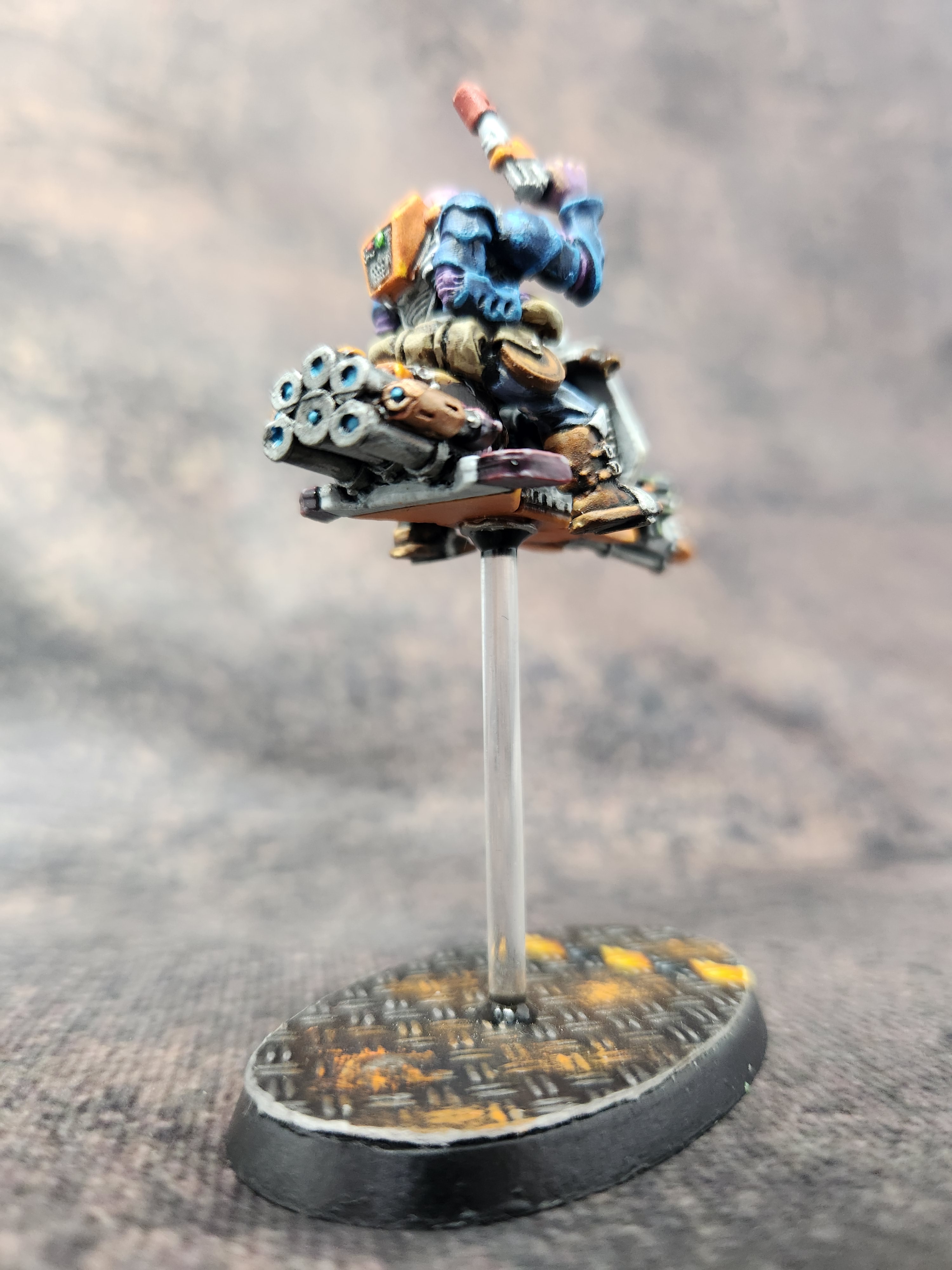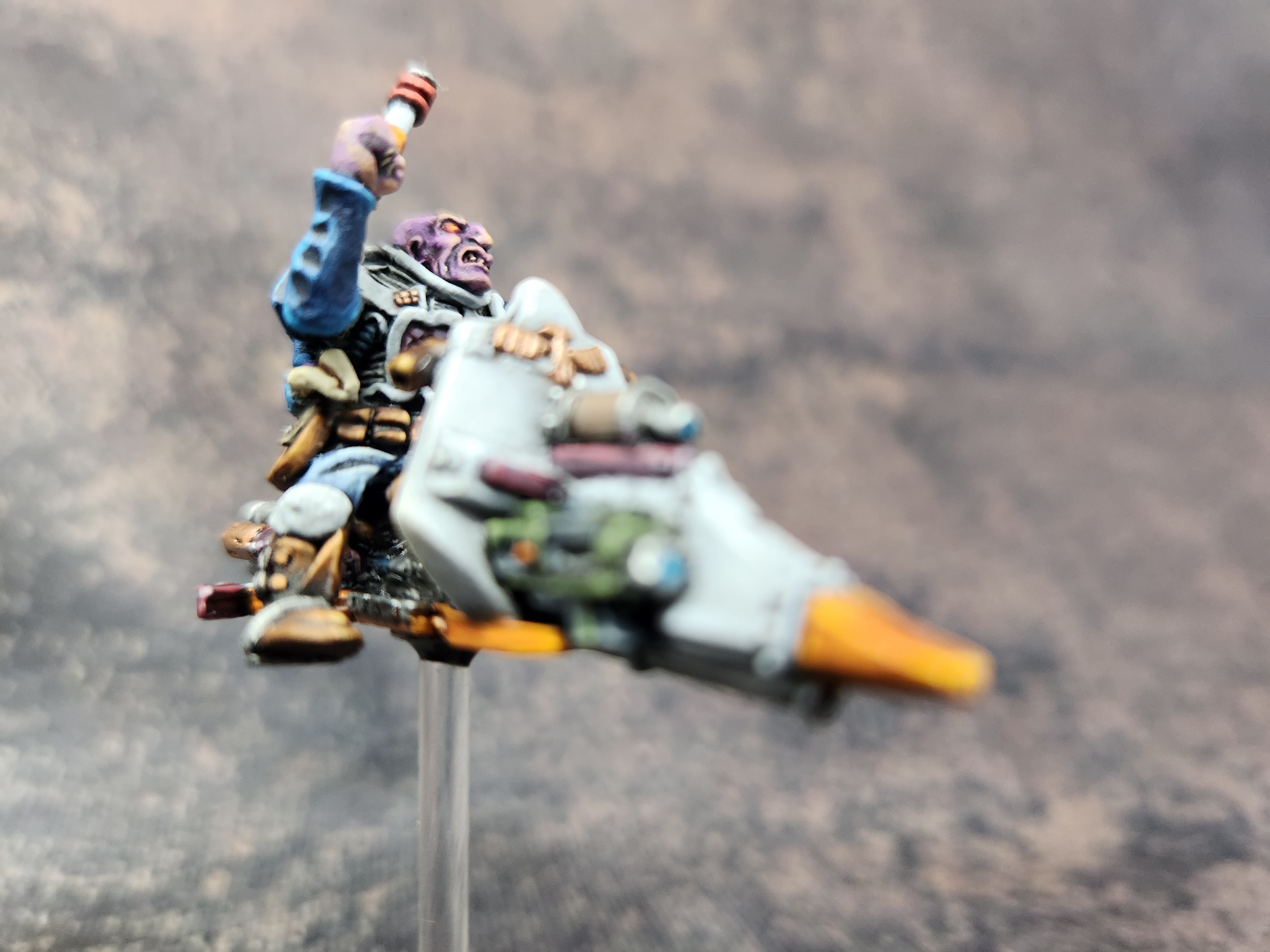 I’ve used my regular colour scheme – classic blue chitin and sickly purple flesh, pale grey armour, with primarily orange, burgundy, and green spot colours – and painted the model in three sub assemblies: the base, the rider, and the bike. I think the overall effect is either of some kind of law enforcer for the cult (or perhaps a hijacked bike), and I am very please with it.