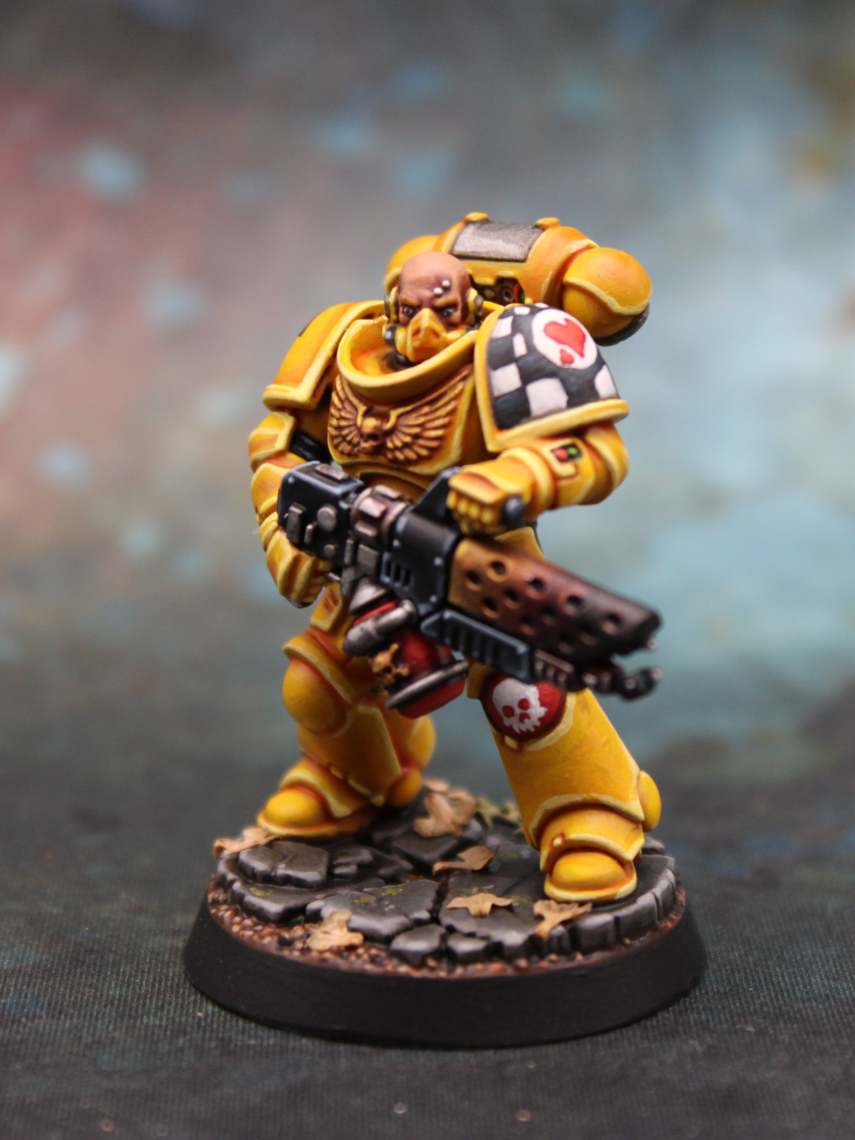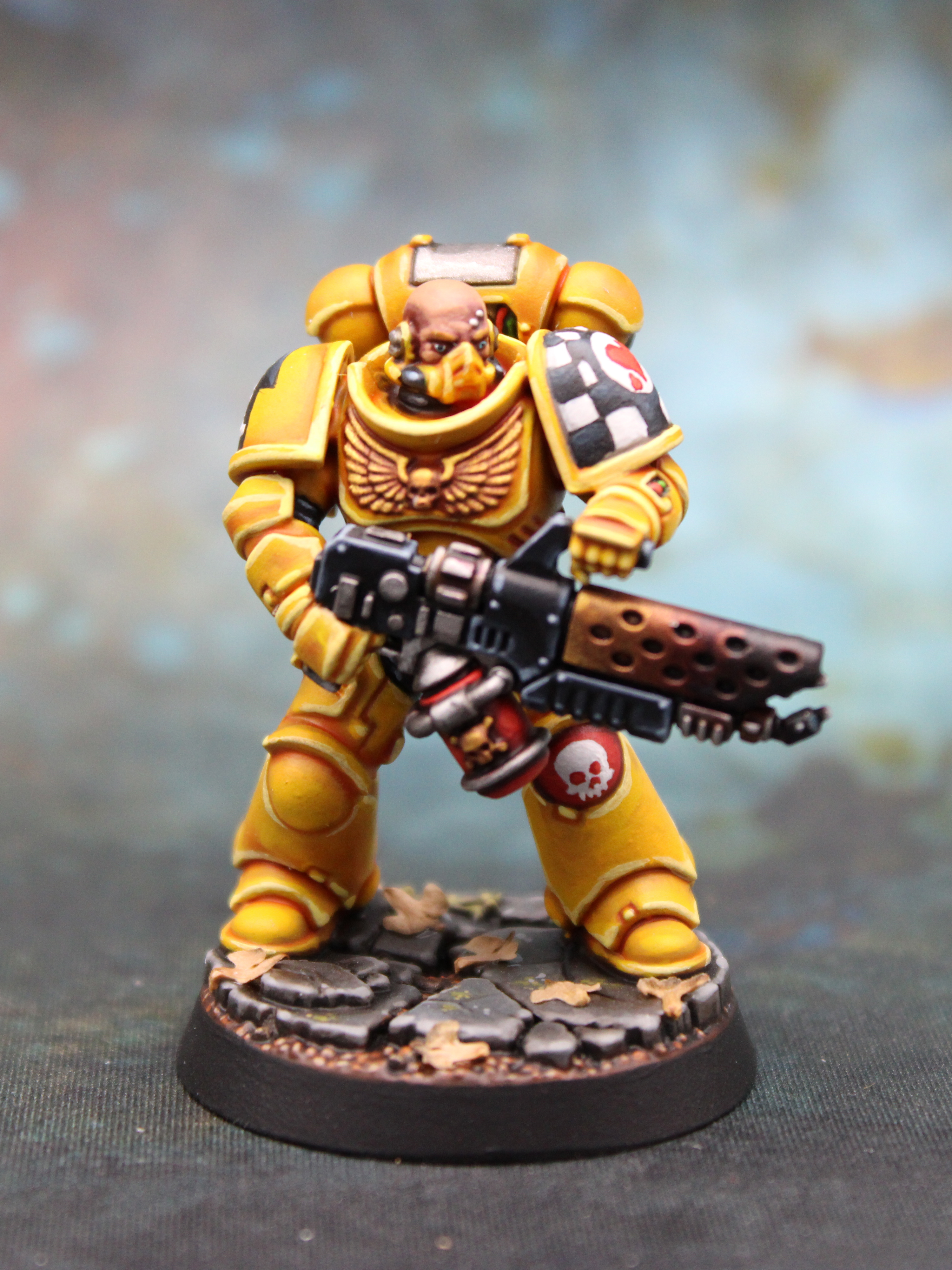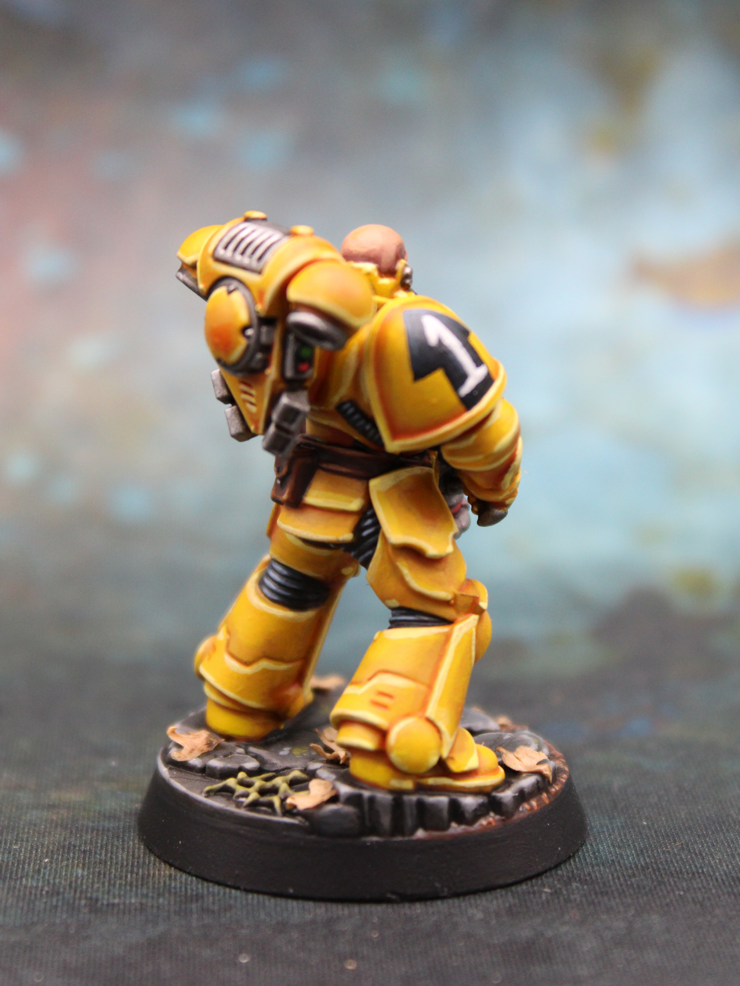 I wanted to do something visually very distinct from any of my other projects. I’ve used a lot of purple for my genestealer cult and to a lesser extent my xenofauna, and I also seem to use quite a lot of green, so my wife suggested that I try yellow. There’s a few classic Space Marine chapters that fit the bill but the lore, and the challenge of painting checkerboard, led me to the Lamenters. They’re the humanitarians of the Warhammer 40K universe, and being an aid worker (albeit with a desk job these days) there’s an obvious appeal. So I headed down to my local Warhammer shop, stocked up on rattle cans and brushes, and picked up a free Space Marine: